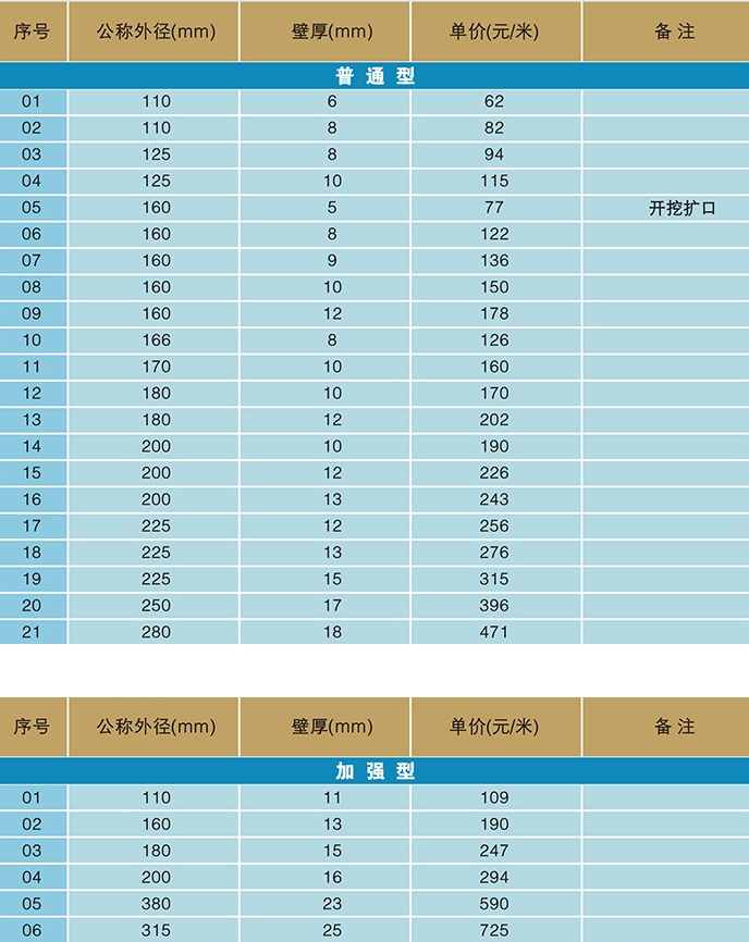 韌性好,具有優良的抗地層沉降及抗震性能。常用管材分為普通型和加強型。普通型適用于開挖鋪設施工和非開挖穿越施工埋深小于4米的工程;加強型用于非開挖穿越施工埋深大于4米的工程。