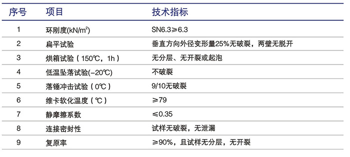 “豐”牌通信用PVC通信用雙壁波紋管經權威部門檢測,產品性能符合郵電標準YD/T 841.3-2008《地下通信管道用塑料管 第3部分:雙壁波紋管》,主要性能指標如下表:
